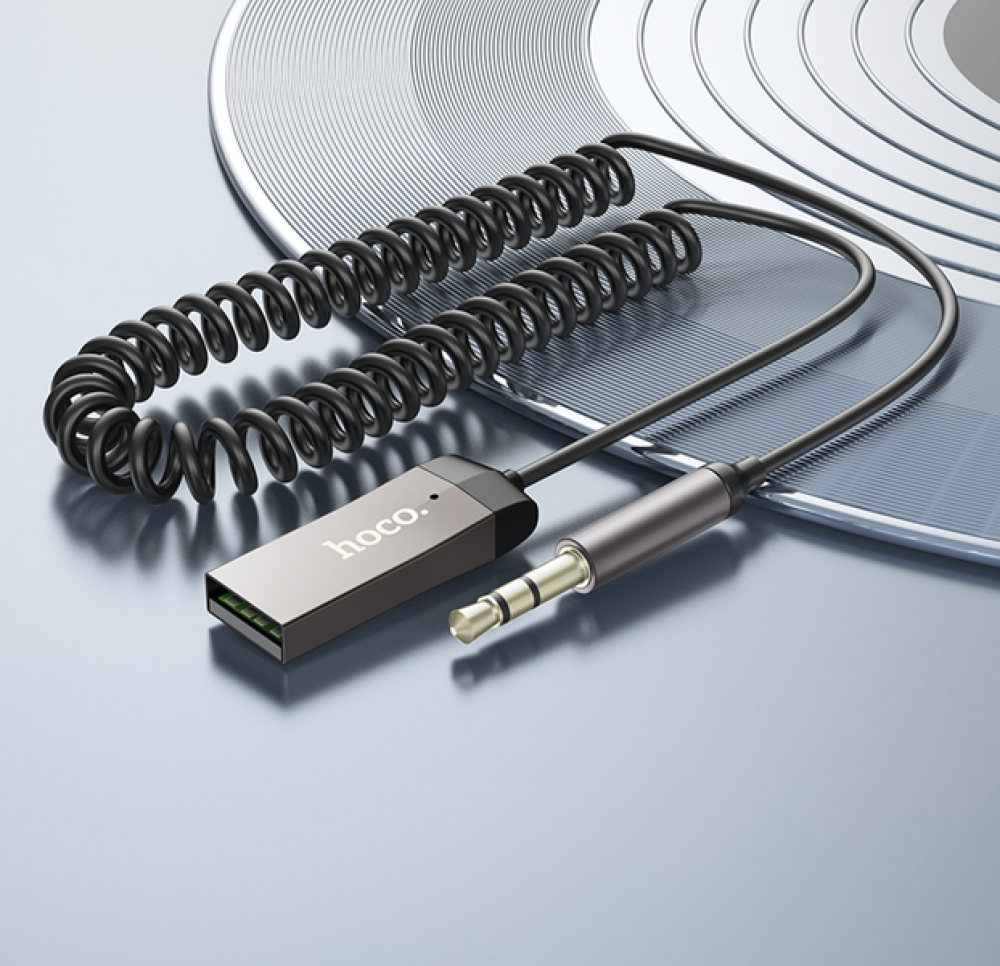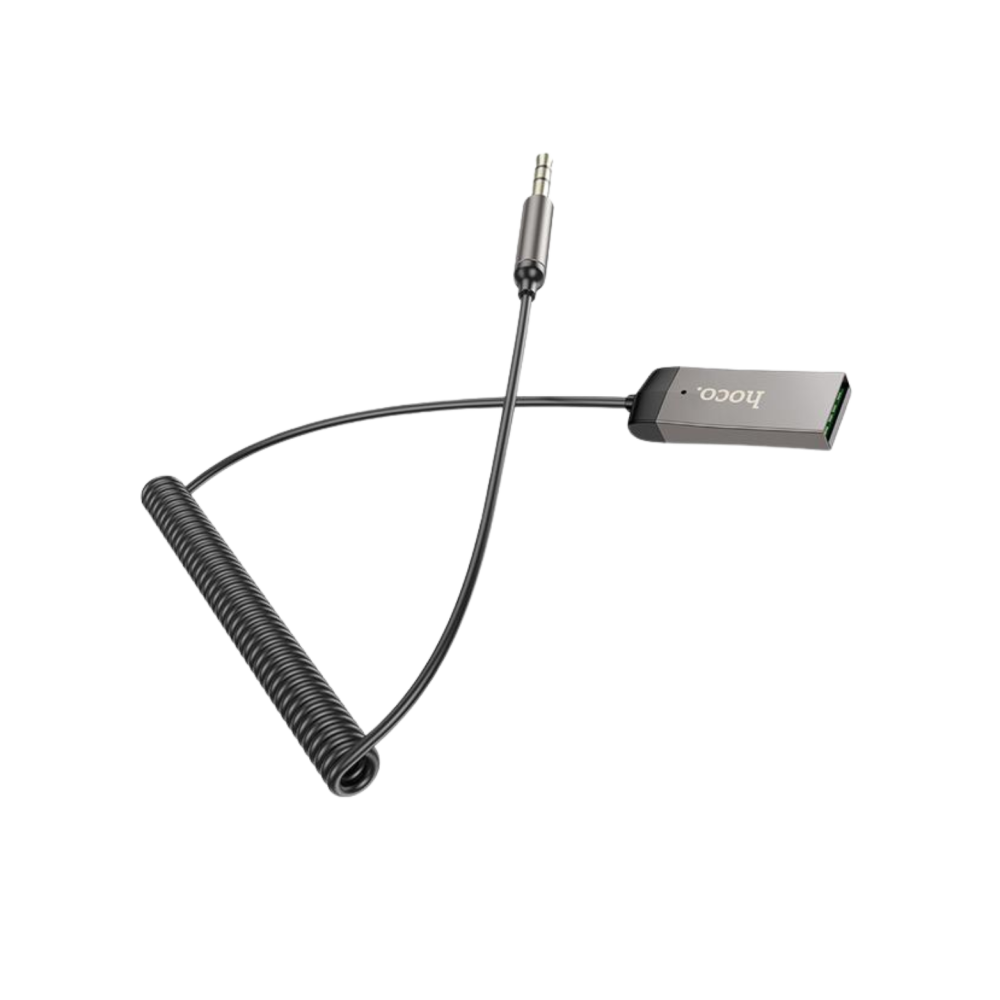 كيبل أسود معدني رمادي مستقبل بلوتوث بأبعاد مدمجة.