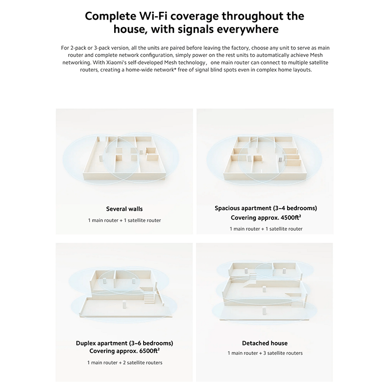 التغطية وقابلية التوسعة: وحدة واحدة تغطي مساحة متوسطة إلى كبيرة (حسب الجدران والتداخل)، ويمكن إضافة وحدات أخرى لتغطية مساحات أكبر.